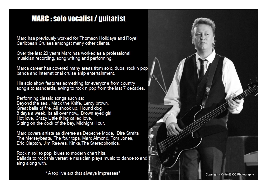 Marcs career has covered many areas from rock n pop bands to international cruise ship entertainment.